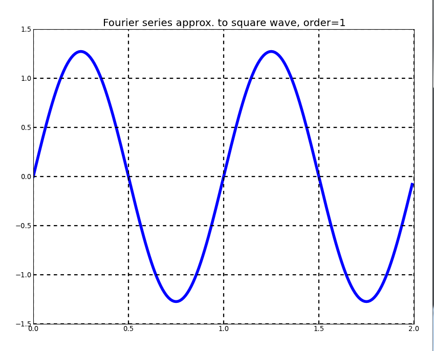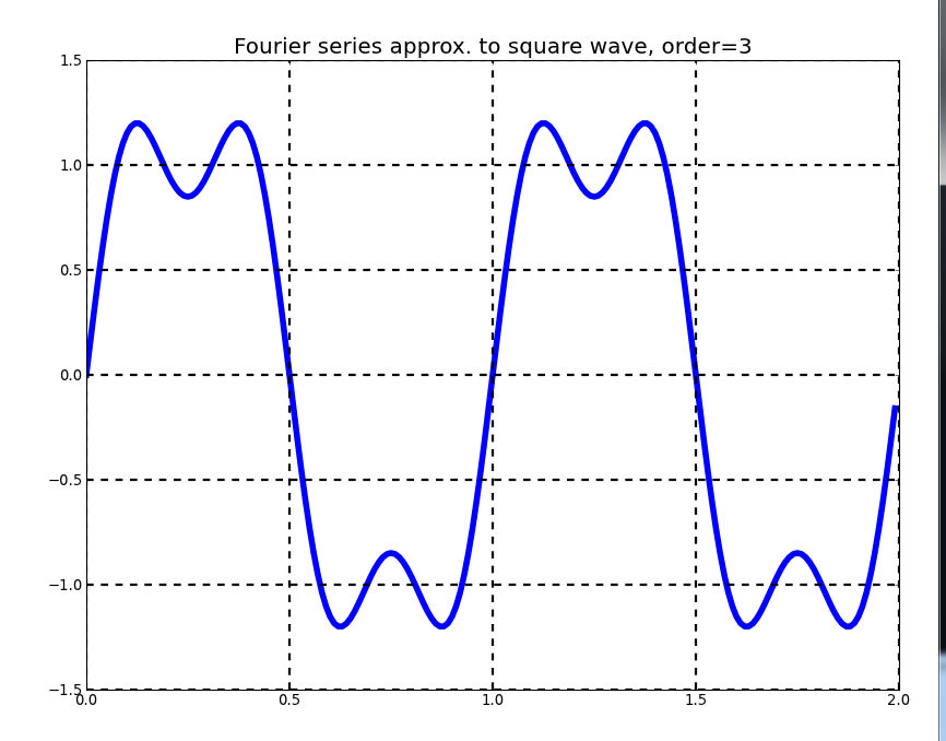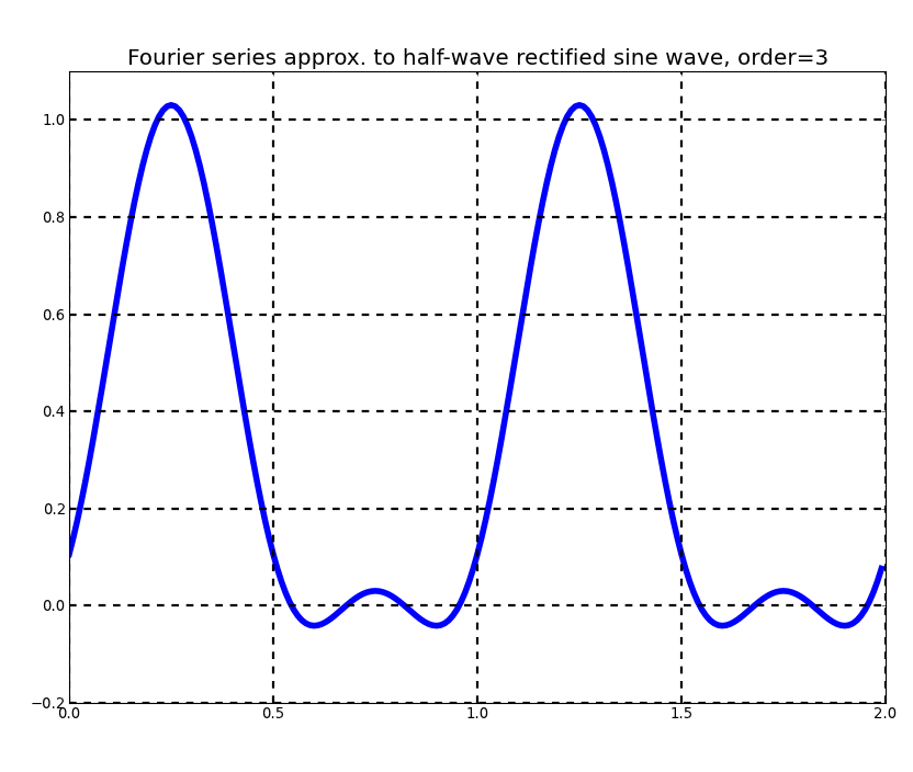 This program generates successive Fourier series approximations to a square wave, triangle wave, sawtooth wave, full-wave rectified sine wave, or half-wave rectified sine wave. Sample output appears below.
